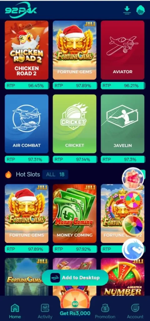 92 PAK Game is a platform with lots of casino games at its heart. This is a pocket-sized casino-style earning application that offers free-roaming Pakistani users simple games to play. It is crafted for simple to modern mobile devices, ensuring smooth and easy performance while giving players chances to fill up their accounts.